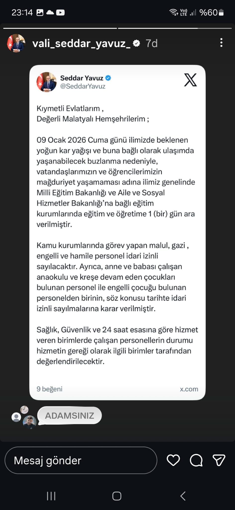 9 Ocak Cuma Günü Okullar TatilVali Seddar Yavuz Twiter Hesabından Açıkladı Okullar Yarin Tatil