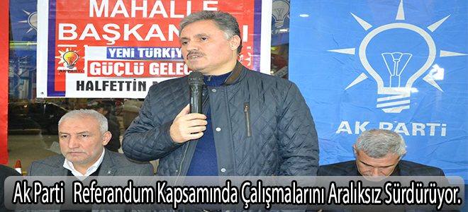 AK Parti Malatya İl Teşkilatı, 16 Nisan'da yapılacak olan referandum kapsamında çalışmalarını aralıksız sürdürüyor. Mahalle mahalle dolaşarak gece gündüz vatandaşlarla bir araya gelen AK Partili temsilciler, Halfettin Mahallesi'nde de bir toplantı gerçekleştirdiler. Mahalle toplantısında ilk olarak söz alan AK Parti Battalgazi İlçe Başkanı Osman Güder, 16 Nisan'ın Türkiye için bir dönüm noktası olduğunu vurguladı. "16 Nisan'ı siyasi olarak değil Türkiye'nin geleceği olarak değerlendiriyoruz" diyen Güder, ülkenin geleceğine sahip çıkmak adına vatandaşlara 'oylarınızı kullanın' çağrısı yaptı.