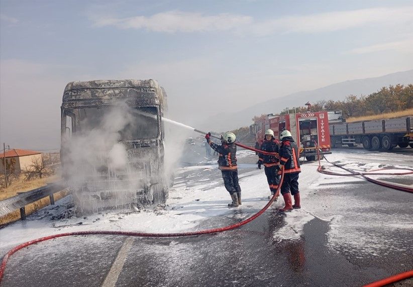 Malatya-Elazığ Karayolu Kale ilçesi mevkiinde inşaat malzemesi yüklü bir tırda çıkan yangın, itfaiye ekiplerince söndürüldü.