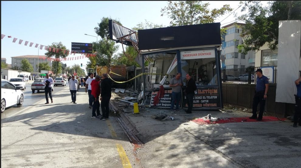 Malatya'da sürücüsünün kontrolünden çıkan hafriyat kamyonu, refüjdeki ağaçlara çarptıktan sonra cadde üzerindeki konteyner iş yerlerine daldı. Kazada facianın eşiğinden dönülürken 4 iş yeri kullanılamaz hale geldi.