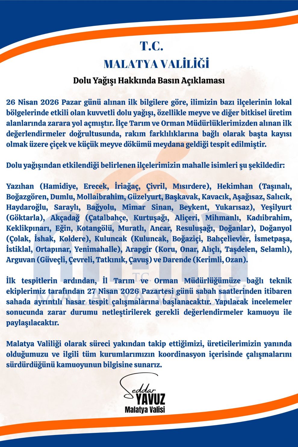 Malatya Valisi Seddar Yavuz Malatya da doludan etkilenen bölgeleri açıkladı.Vali Yavuz konuya ilşkin yaptığı basın açıklamasında şunları belirtti: